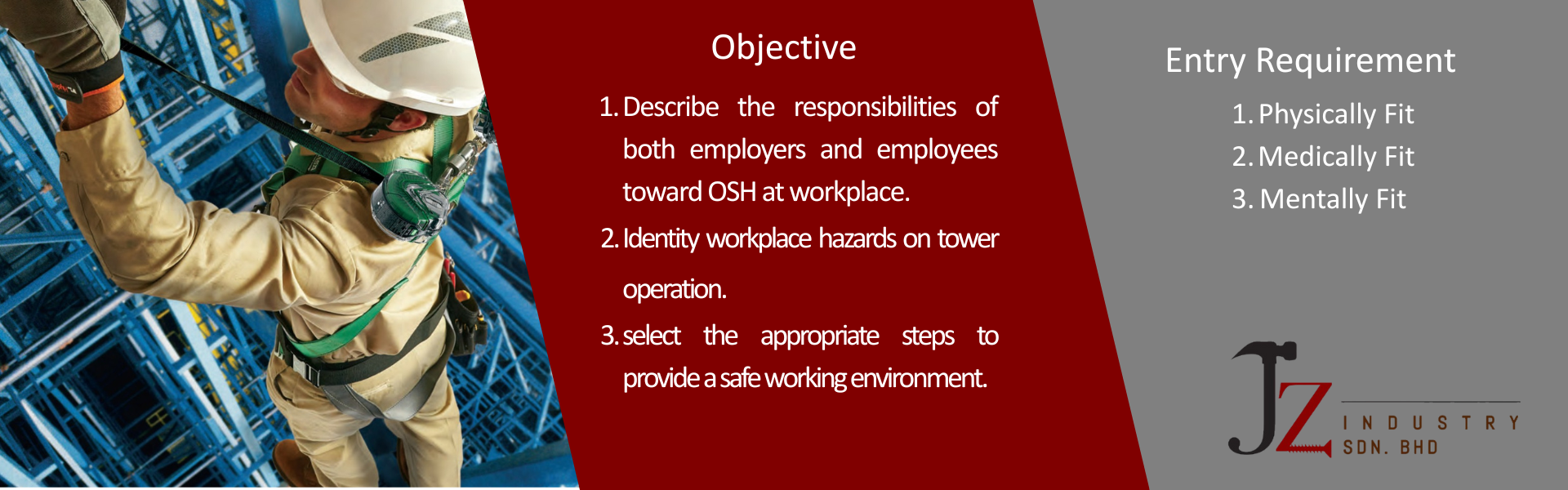 Participants must be in good physical and mental condition to take part in this training and should inform the trainer if they feel unwell at any time. They are required to follow all safety instructions, precautionary signs, and directions from the trainer or authorized personnel, and must avoid any unsafe or unauthorized activities. Failure to comply may result in suspension or removal from the program. Participation is at their own risk, and JZ Industry Sdn. Bhd. shall not be held liable unless